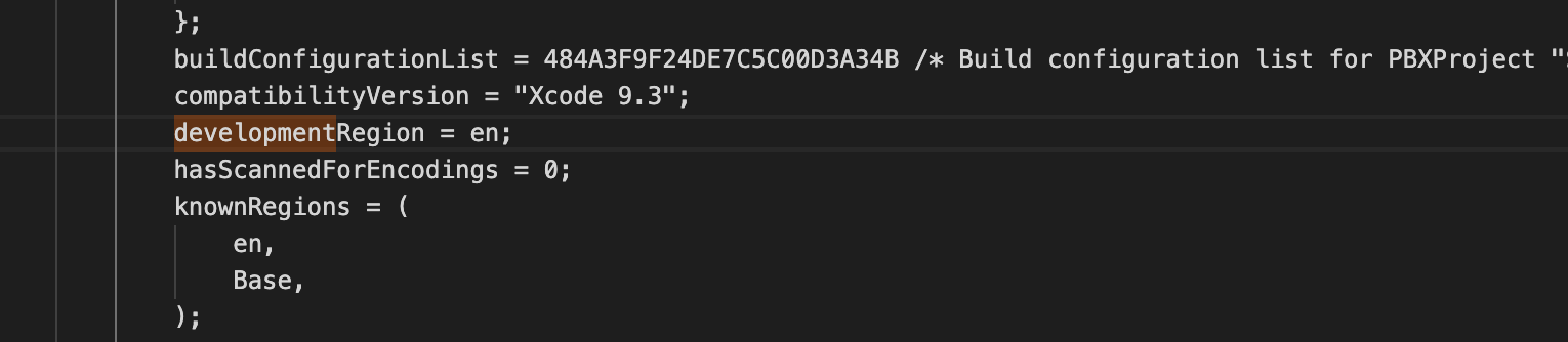 .xcodeproj 파일을 editor로 열고 "developmentRegion"로 검색하면 'en' 으로 설정되어있는 것을 볼 수 있습니다.